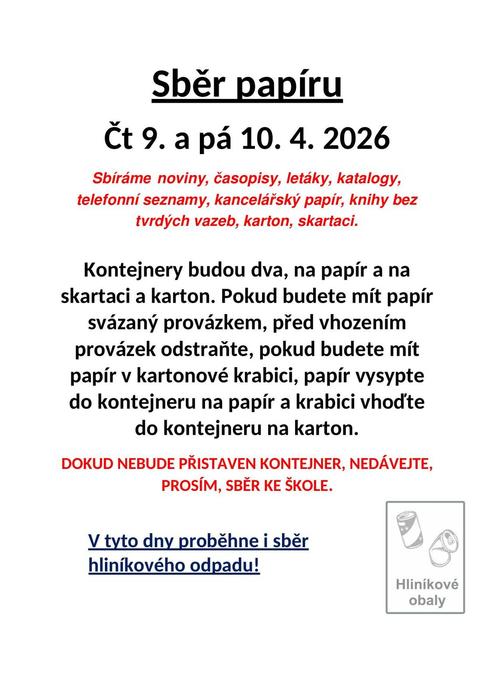 Ve čtvrtek 9.4. a v pátek 10.4. 2026 proběhne v naší škole sběr papíru a hliníkového odpadu.