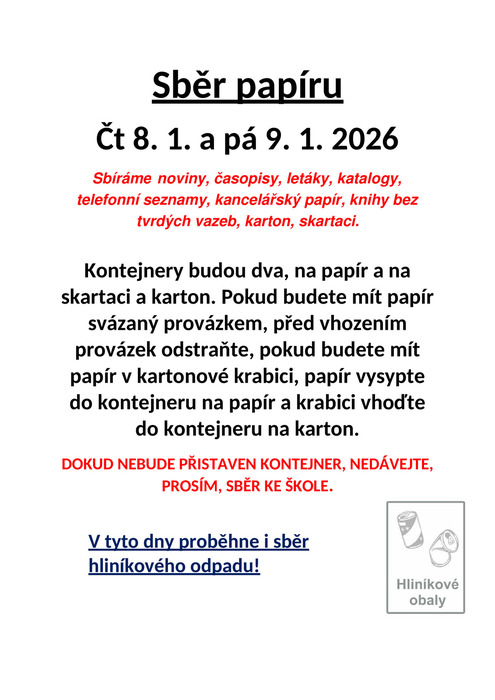 Ve čtvrtek 8.1. a v pátek 9.1. 2026 proběhne v naší škole sběr papíru a hliníkového odpadu.
