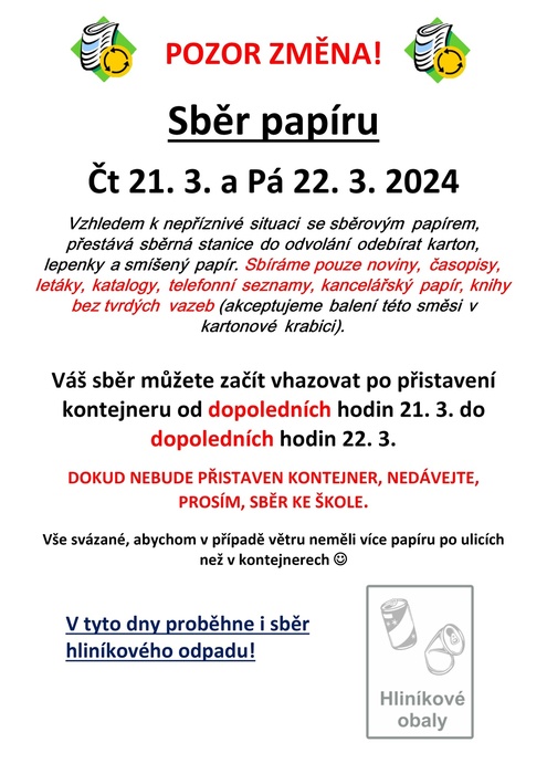 Sběr papíru proběhne ve dnech 21.-22. 3. 2024. V tyto dny proběhne i sběr hliníkového odpadu.