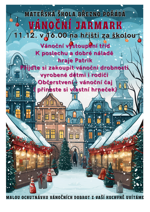 Mateřská škola Březno zve na Vánoční jarmark, který se uskuteční dne 11.12. 2025 v 16hod na hřišti za školou. Vystoupí třídy MŠ, k poslechu a dobré náladě hraje Patrik.